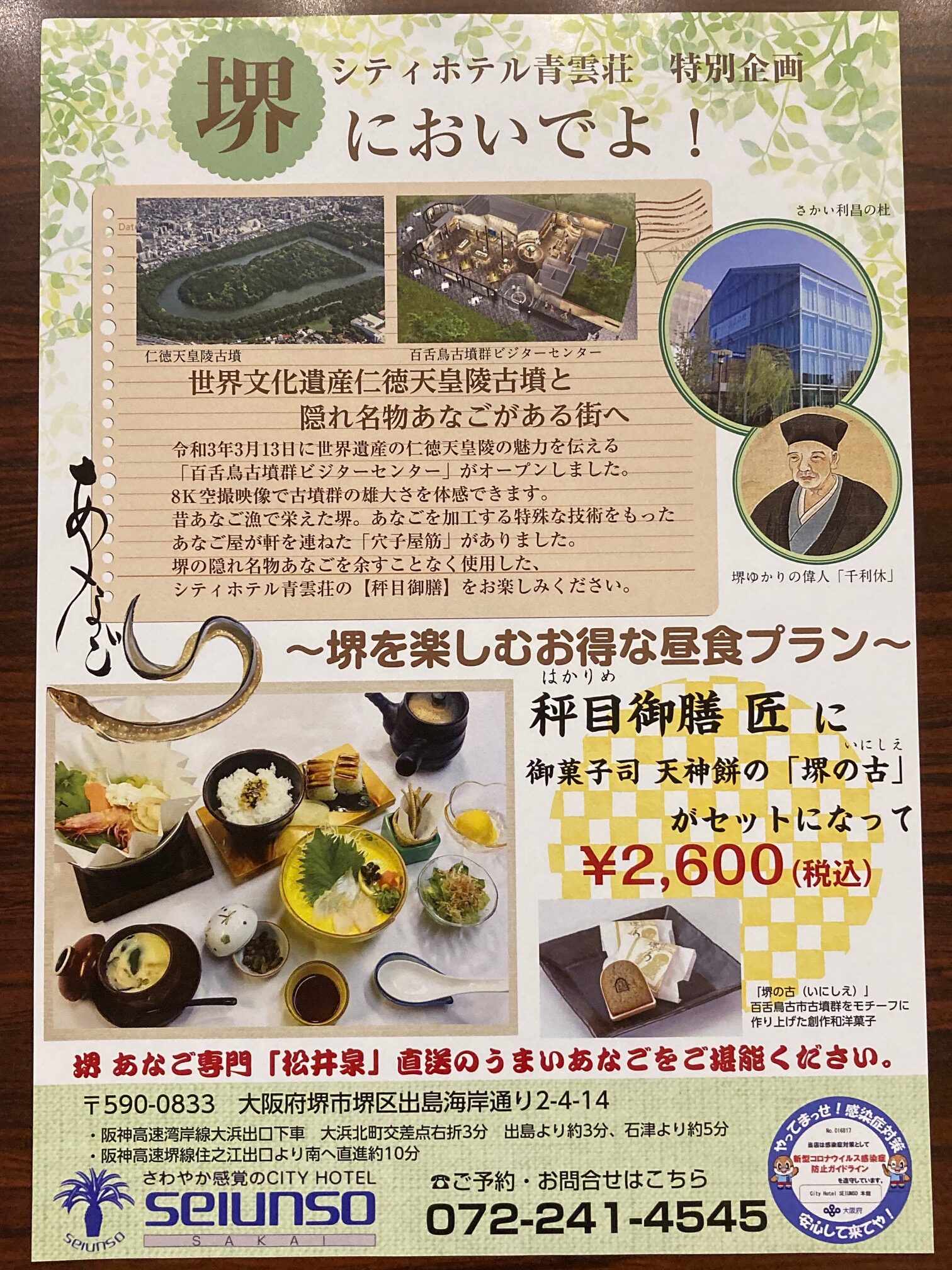 オープン記念といたしまして、シティホテル青雲荘でも、少しでもこの”世界遺産《仁徳天皇陵(百舌鳥・古市古墳群)》”、そして”堺”を盛り上げたいと、【秤目御膳「匠」】に堺の銘菓《天神餅》さんの【堺の古(いにしえ)】をセットにした昼食プランの特別企画を立ち上げました。