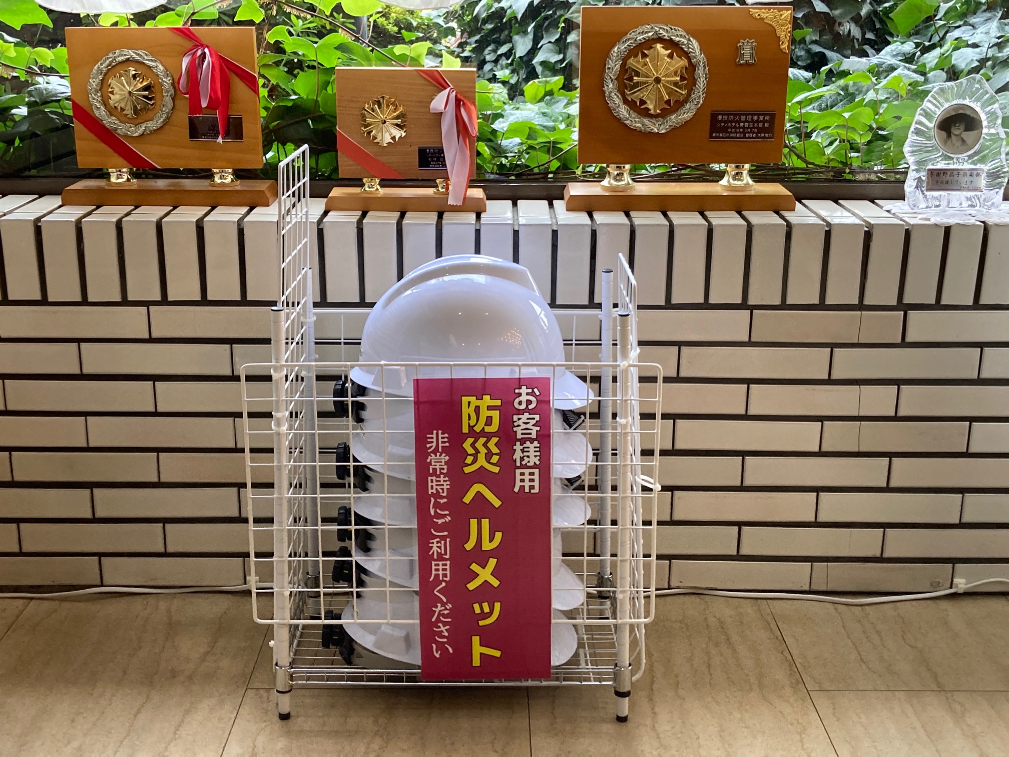 シティホテル青雲荘では、 地震等の災害時にお客様が安全に避難できるよう、非常時の貸し出し用ヘルメットを設置致しております。